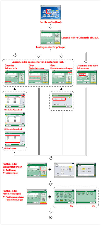 Berühren Sie diese Taste, um Dokumente direkt an den Empfänger zu senden. Wenn Sie nicht <Direkte Sendung> wählen, wird stattdessen die Speichersendung verwendet. (Vgl. Abschnitt "Umschalten auf Direkte Sendung".)