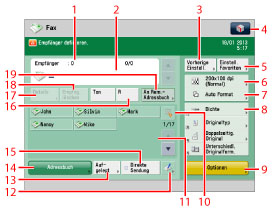 Berühren Sie diese Taste, um hilfreiche Faxfunktionen wie zum Beispiel das gemeinsame Senden von Originalen unterschiedlicher Größe oder das Senden von doppelseitigen Originalen einzustellen.