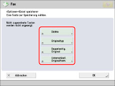 Es werden vier Optionen-Kürzel auf der Anzeige für Grundeigenschaften des Faxens angezeigt. [Dichte], [Originaltyp], [Doppelseitig. Original] und [Unterschiedl. Originalform.] sind die Standardwerte. Diese Kürzel können mit Funktionen belegt werden, die Sie häufig verwenden.