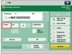 Die Pause muss so lang sein, dass Sie das Freizeichen der Amtsleitung hören, bevor die Faxnummer gewählt wird.