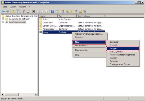 Klicken Sie mit der rechten Maustaste auf den Container und die Organisationseinheit, die Sie hinzufügen möchten.
