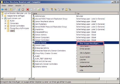 Fügen Sie der Gruppe 'Canon Peripheral Admins' oder einer beliebigen Active Directory-Gruppe einen registrierten Anwender hinzu, damit dieser Anwender zum Server Authentication-Administrator wird. Führen Sie die nachstehenden Schritte aus, um die Gruppe 'Canon Peripheral Admins' hinzuzufügen.