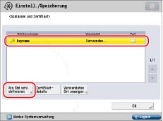 Sie können prüfen, wofür ein Schlüsselpaar verwendet wird, indem Sie auf dem Display 'Schlüssel und Zertifikat' ein Schlüsselpaar mit 'Verwendet' unter <Status> auswählen und [Verwendeten Ort anzeigen] berühren.