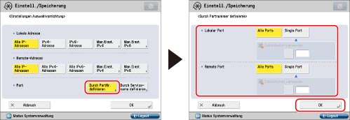 Berühren Sie [Durch PortNr. definieren] für [Port] → Geben Sie <Lokaler Port> und <Remote Port> an → Berühren Sie [OK].