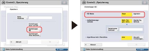 Berühren Sie [Einstellungen IKE] → Wählen Sie den für IKE Phase 1 zu verwendenden Modus aus.