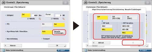 Wählen Sie [Manuelle Einstellungen] für <Algorithmus Auth./Verschlüss.> aus → Legen Sie den Authentisierungs- und Verschlüsselungsalgorithmus für IKE SA fest → Berühren Sie [OK].