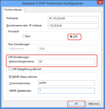Wählen Sie [LPR] in [Protokoll] aus → Geben Sie den Druckwarteschlangennamen in [Warteschlangenname] in [LPR-Einstellungen] ein → Klicken Sie auf [OK].
