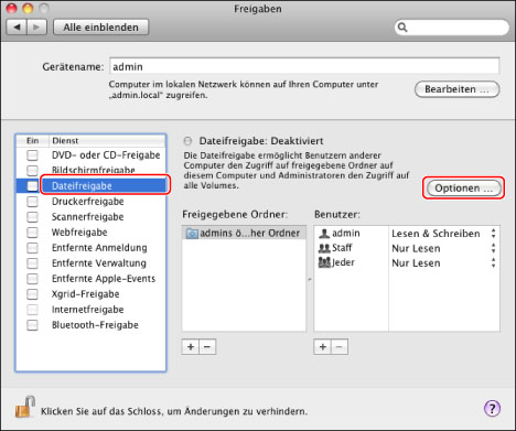 Wählen Sie [Dateifreigabe] aus → Klicken Sie auf [Optionen].