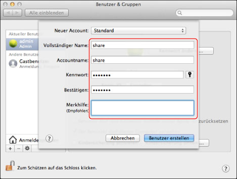 Geben Sie im Fenster [Benutzer]/[Benutzer & Gruppen] den Namen des Benutzers ein, dem Sie Daten vom System über Mac OS X senden möchten → Geben Sie das Passwort ein.