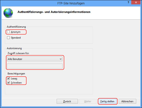 Wählen Sie [Lesen] und [Schreiben] für <Berechtigungen> aus → Klicken Sie auf [Fertig stellen].