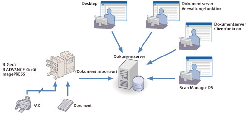 Sie können sowohl mit iW Desktop erstellte Dokumente speichern als auch Dokumente, die mit den Canon-Systemen und der Document Scanner DR-Serie (Dokumentscanner) über das Netzwerk gescannt wurden, und so ein hoch entwickeltes Dokumentenverwaltungssystem zur effizienten Verwaltung von Dokumenten aufbauen.