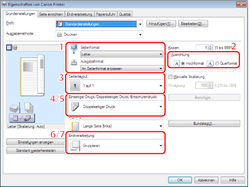 Bedruckt eine oder beide Seiten des Blattes. Die Standardeinstellung für [Einseitiger Druck/Doppelseitiger Druck/Broschürendruck] ist [Doppelseitiger Druck] (vgl. "Einseitendruck/Doppelseitiger Druck").