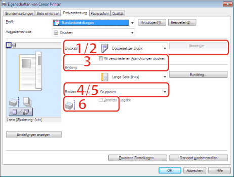 Bedruckt eine oder beide Seiten des Blattes. Die Standardeinstellung für [Druckstil] ist [Doppelseitiger Druck] (vgl. "Einseitendruck/Doppelseitiger Druck").