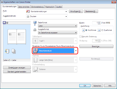 Wählen Sie unter [Einseitiger Druck/Doppelseitiger Druck/Broschürendruck] die Option [Broschürendruck] aus.