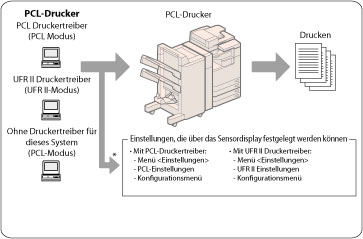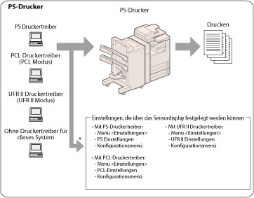 Unterschiede in der Bedienung bei UFR II, PCL, PS und Direct Print Druckern