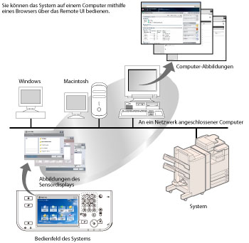 Das Remote UI (User Interface = Anwenderschnittstelle) ist eine im System vorinstallierte Software, mit der Sie über einen Webbrowser auf die Funktionen des Systems zugreifen können. Mit dem Remote UI können Sie beispielsweise auf das System zugreifen, um den Auftragsstatus zu prüfen, Aufträge auszuführen und verschiedene Einstellungen festzulegen. Damit Sie mit dem Remote UI arbeiten können, benötigen Sie lediglich einen Webbrowser und eine Netzwerkverbindung zwischen Ihrem Computer und dem System. Zur Verwendung des Remote UI müssen Sie zunächst über das Bedienfeld eine IP-Adresse (Internet Protocol) für das System eingeben und die notwendige Netzwerkverbindung einrichten.
