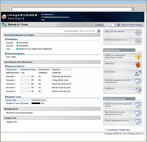 Mithilfe des Remote UI können Sie über das Netzwerk auf das System zugreifen und die Meldungen zum aktuellen Status, den Systemeinstellungen sowie zum Status aller Informationen und zur Jobverarbeitung abrufen. Sie können das System über einen Computer im selben Netzwerk verwalten und müssen die Aktionen nicht am System selbst vornehmen. Beim Aufrufen der IP-Adresse des Systems mit Ihrem Webbrowser wird folgende Startseite der Remote UI-Software auf dem Computerbildschirm angezeigt: