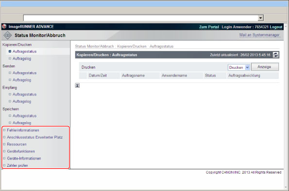 Hier werden der aktuelle Status der Einheit, z. B. Papiervorrat und Informationen zur Wartung (Verbrauchsmaterial) angezeigt.