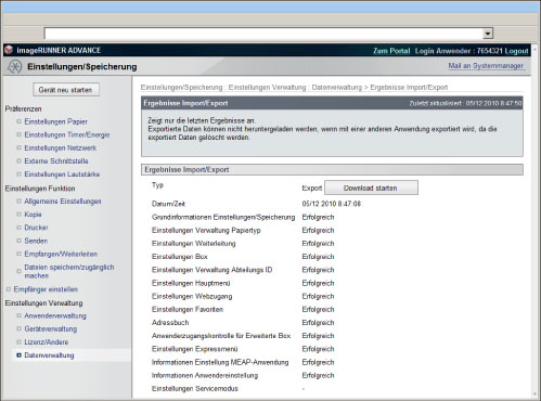 Sie können die letzten Import/Export-Ergebnisse auch prüfen, indem Sie [Datenverwaltung] für <Einstellungen Verwaltung> berühren → [Ergebnisse Import/Export].
