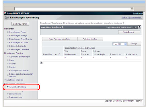 Die Einstellungen zur Verwaltung per Abteilungs ID, die Ihnen mit dem Remote UI zur Verfügung stehen, entsprechen denen, die Sie über das Bedienfeld des Systems aufrufen, indem Sie nacheinander die Tasten [Anwenderverwaltung] (<Einstellungen/Speicherung>) → [Verwaltung per Abteilungs ID] berühren. Nähere Informationen zur Verwendung des Bedienfelds zum Festlegen der Einstellungen für die Verwaltung per Abteilungs ID sowie zur Verwaltung per Abteilungs ID finden Sie im Abschnitt "Verwaltung per Abteilungs ID".