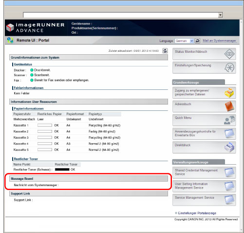 Wenn Sie [Anzeige auf dem Portal] wählen, wird das Message Board auf der Portalseite des Remote UI angezeigt.