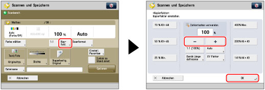Berühren Sie die Taste [Kopfakt.] → Wählen Sie den gewünschten Zoomfaktor über die Tasten [-] und [+] → Bestätigen Sie durch Berühren der Taste [OK].