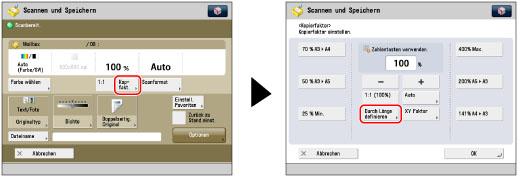 Mit dieser Funktion können Sie Originale vergrößern oder verkleinern, indem Sie die Maße des Originals und des Kopierpapiers einzeln eingeben. Sie können einen Zoomfaktor von 25 % bis 400 % einstellen, wenn Sie das Original auf das Vorlagenglas legen, und von 25 % bis 200 %, wenn Sie das Original in den Einzug einlegen.