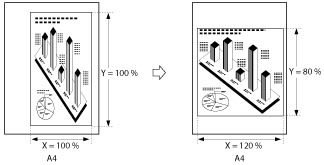 Sie können Originale mit einem beliebigen Zoomfaktor innerhalb des Zoombereichs in 1 %-Schritten vergrößern und verkleinern. Der Zoombereich reicht von 25 % bis 400 % für die Mailbox-Funktion, und von 50 % bis 200% für die Funktionen Erweiterter Platz, Netzwerk oder Speichermedium. Waagerechte und Senkrechte werden im gleichen Zoomfaktor vergrößert/verkleinert.
