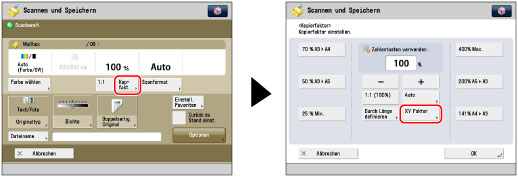 Sie können Voreinstellungen für Abbildungsmaßstäbe (Zoom) verwenden, um Originale mit Standardgröße auf andere Standardformate zu vergrößern oder zu verkleinern.