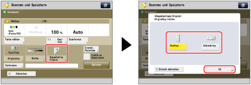 Wenn Sie jede Seite von Vorlagenglas aufgelegten doppelseitigen Originalen scannen wollen, legen Sie die Einstellungen [Fortlaufendes Scannen] fest. (Vgl. Abschnitt "Fortlaufendes Scannen".)