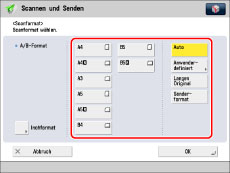 Berühren Sie die Taste [Scannen und Senden] → Berühren Sie die Scanformat-Taste.