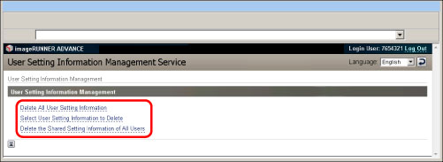 Wählen Sie die Methode, um die Anwenderinformationen über die Seite <User Setting Information Management Service> zu löschen.
