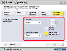 Nähere Informationen zum Eingeben von Zeichen finden Sie im Abschnitt "Zeicheneingabe über das Sensordisplay". Wenn Sie in [Zeichen für Seitennum./Wasserz. speichern] in [Einstellungen Funktion] (Einstellungen/Speicherung) Zeichen registriert haben, können Sie die Zeichen aus der Liste auswählen.