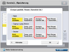 Wenn Secure Watermark aktiviert ist, berühren Sie die Taste [Zwangsw. Scansch.Dok.] für die Funktion (<Kopie>/<Zugang zu gesp.Dateien>/<Drucker>), um die Funktion <Zwangsweiser Scanschutz Dokument> zu aktivieren.