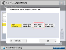 Wenn Secure Watermark aktiviert wurde, berühren Sie die Taste [Druckertreiber Wasserzeich./Scanschutz Dok.].