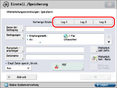 Weiterleitungseinstellungen für empfangene Dateien, die sich nicht im Speicher befinden, werden nicht angezeigt. Sie werden auch dann nicht angezeigt, wenn Sie eine Taste für <Vorherige Einstell.> berühren.
