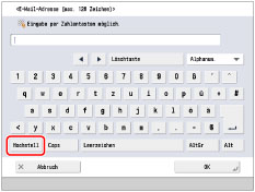 Wenn Sie [Hochstell.] auf dem Tastatur-Display drücken, wird der nächste eingegebene Buchstabe ein Großbuchstabe. [Hochstell.] wird bei jeder Zeicheneingabe wieder aufgehoben, und der jeweils folgende Buchstabe ist ein Kleinbuchstabe.