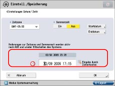 Auf dem Display <Einstellungen/Speicherung> können Sie die Einstellungen zu Datum und Uhrzeit auch automatisch mit einem Server im Netzwerk mithilfe von SNTP synchronisieren lassen. (Vgl. Abschnitt "Gemeinsame Einstellungen von TCP/IPv4 und TCP/IPv6".)