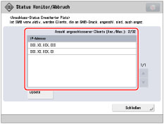 Wenn der Erweiterte Platz über SMB öffentlich verfügbar ist und in [SMB verwenden] in [Präferenzen] (<Einstellungen/Speicherung>) aktiviert ist, werden an SMB-Drucker angeschlossene Clients ebenfalls angezeigt und als angeschlossene Clients gezählt. Anweisungen zur Einstellungen des Erweiterten Platzes auf öffentlich verfügbar über SMB oder WebDAV finden Sie im Abschnitt "Einstellungen für Erweiterten Platz/Netzwerk".