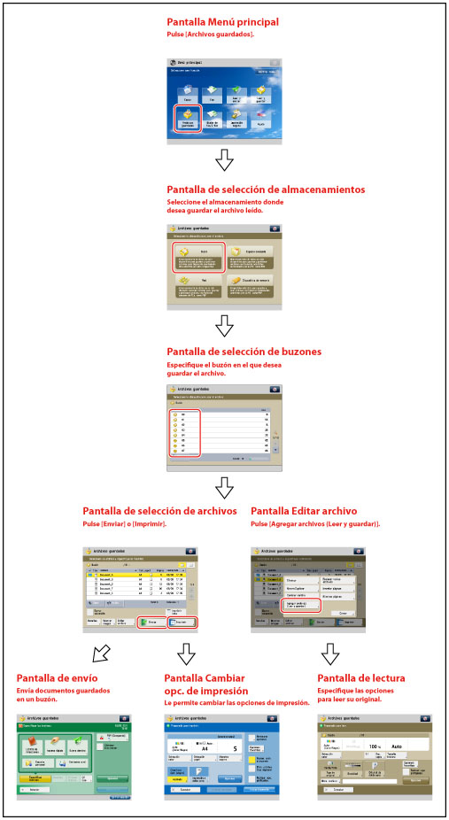 Para ver el procedimiento acerca de [Agregar archivos (Leer y guardar)] y conocer las instrucciones acerca del manejo de la pantalla de lectura, consulte "Agregar un archivo (Leer y guardar)" y "Flujo de operaciones de leer y guardar".