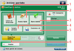 Muestra la pantalla para guardar/especificar botones de acceso rápido. Pulse [Libr. direc. remota] para especificar destinos guardados en los botones de acceso rápido de un equipo servidor mediante acceso desde un equipo cliente de la red. Para más información, consulte "Especificar destinos desde los botones de acceso rápido de un equipo servidor". |
