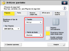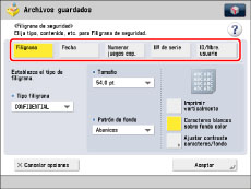 El texto que introduzca en [Person.] no se guarda automáticamente. Si desea guardar la filigrana de seguridad recién creada para seleccionarla cuando lo necesite, pulse [Guardar] → introduzca el texto que vaya a guardar.