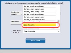 Si está usando el sistema de autenticación de usuarios 'Autenticación de servidor' de SSO-H (incluida al realizar la autenticación de dominio con el sistema de autenticación de usuarios 'Autenticación de servidor + Autenticación de dispositivo local'), seleccione el destino de inicio de sesión en la lista desplegable. Para más información acerca de la selección del destino de inicio de sesión, consulte "SSO-H (Single Sign-On H)".