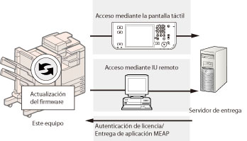 Puede actualizar el firmware del equipo a la versión más reciente con la función "Registrar/Actualizar software". Puede utilizar esta función tanto desde la pantalla táctil como desde el ordenador (IU remota).