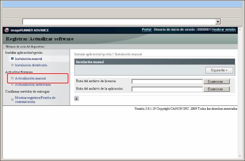 Desde la página del portal de IU remota, haga clic en [Configuración] → [Licencias/Otros] → [Registrar/Actualizar software].