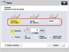 Si está activada la función [Autoclasificar], se establecerá automáticamente el modo Clasificar o el modo Clasificar y desplazar al poner los originales en el alimentador. (Consulte "Activar la clasificación automática".)