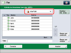 Si pulsa [Iniciar búsqueda] sin especificar ningún criterio de búsqueda, aparecen todas las direcciones guardadas en el servidor LDAP.