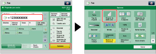 Especifique el destino → pulse [Opciones] → [Original de doble cara].
