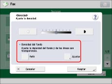 Si ajusta la densidad de fondo pulsando [Ajustar] para <Densidad del fondo>, se cancela la opción [Auto]. De forma similar, si pulsa [Auto] mientras realice ajustes manualmente en [Ajustar], sus ajustes se cancelarán. El equipo ajusta automáticamente la densidad para que coincida con el fondo.