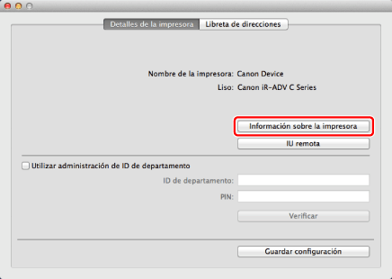 Si el nombre del controlador de fax que se muestra en la parte superior del cuadro de diálogo [Información sobre la impresora] no se corresponde con el nombre de fax que se muestra como [Nombre recuperado de la impresora], es posible que no pueda utilizar las funciones del fax correctamente. Si los nombres no se corresponden, elimine el fax que ha añadido en [Preferencias del Sistema] y vuelva a añadirlo. Para obtener información detallada, consulte la Guía del controlador de fax Canon (consulte " Instalación").